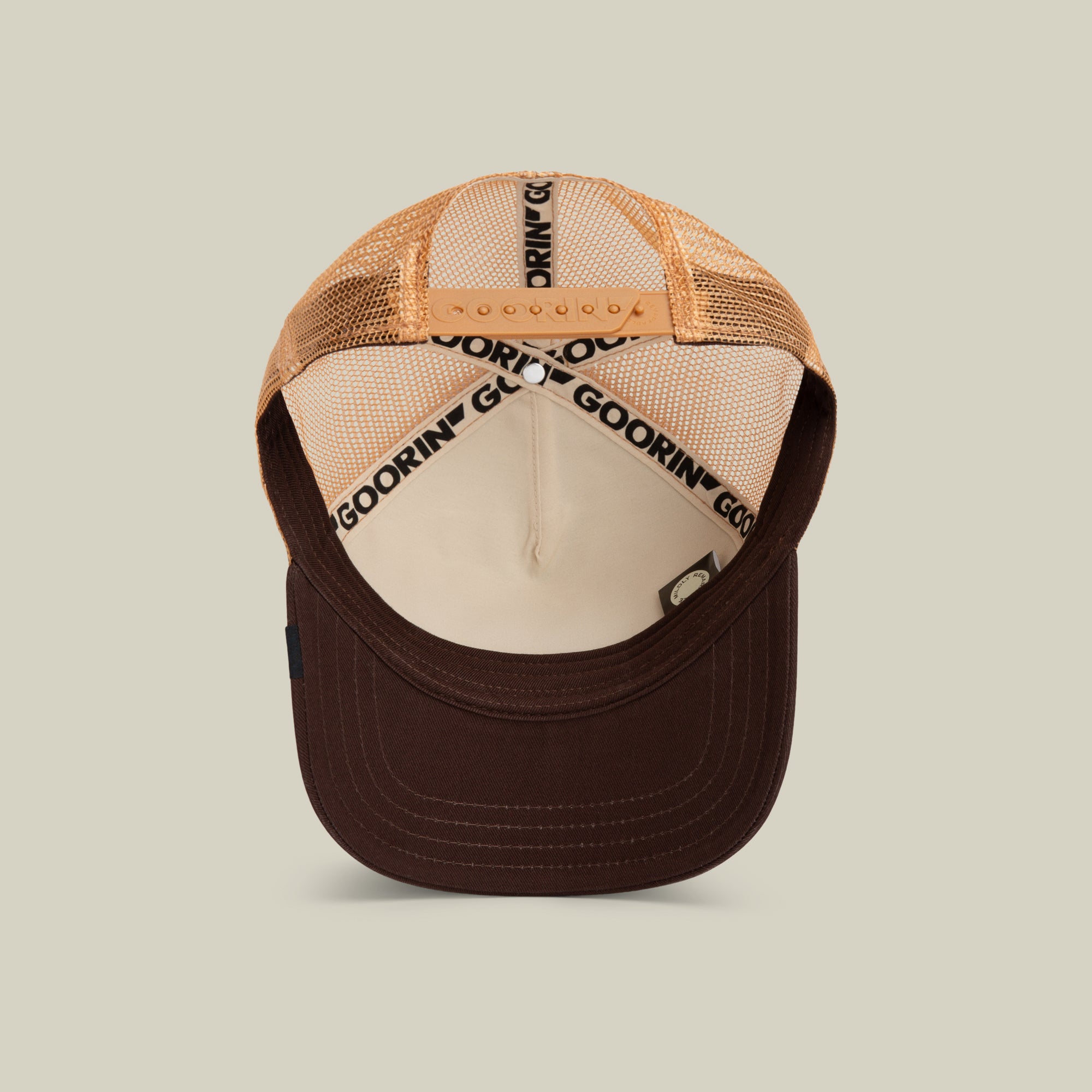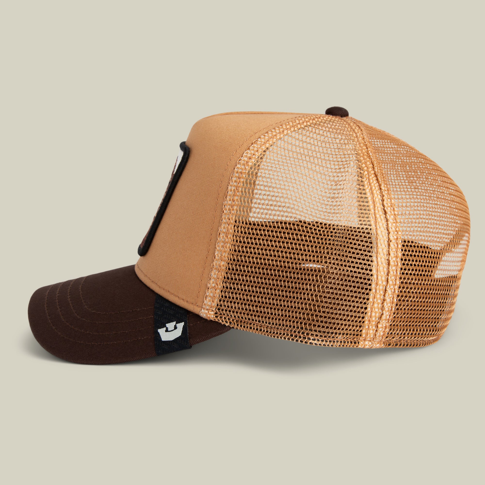 The lion patch stares down the room so you don’t have to. Gold crown tones, dark brim foundation—power dressing for your head. It doesn’t whisper royalty, it growls it. Wear it like you own the savanna.