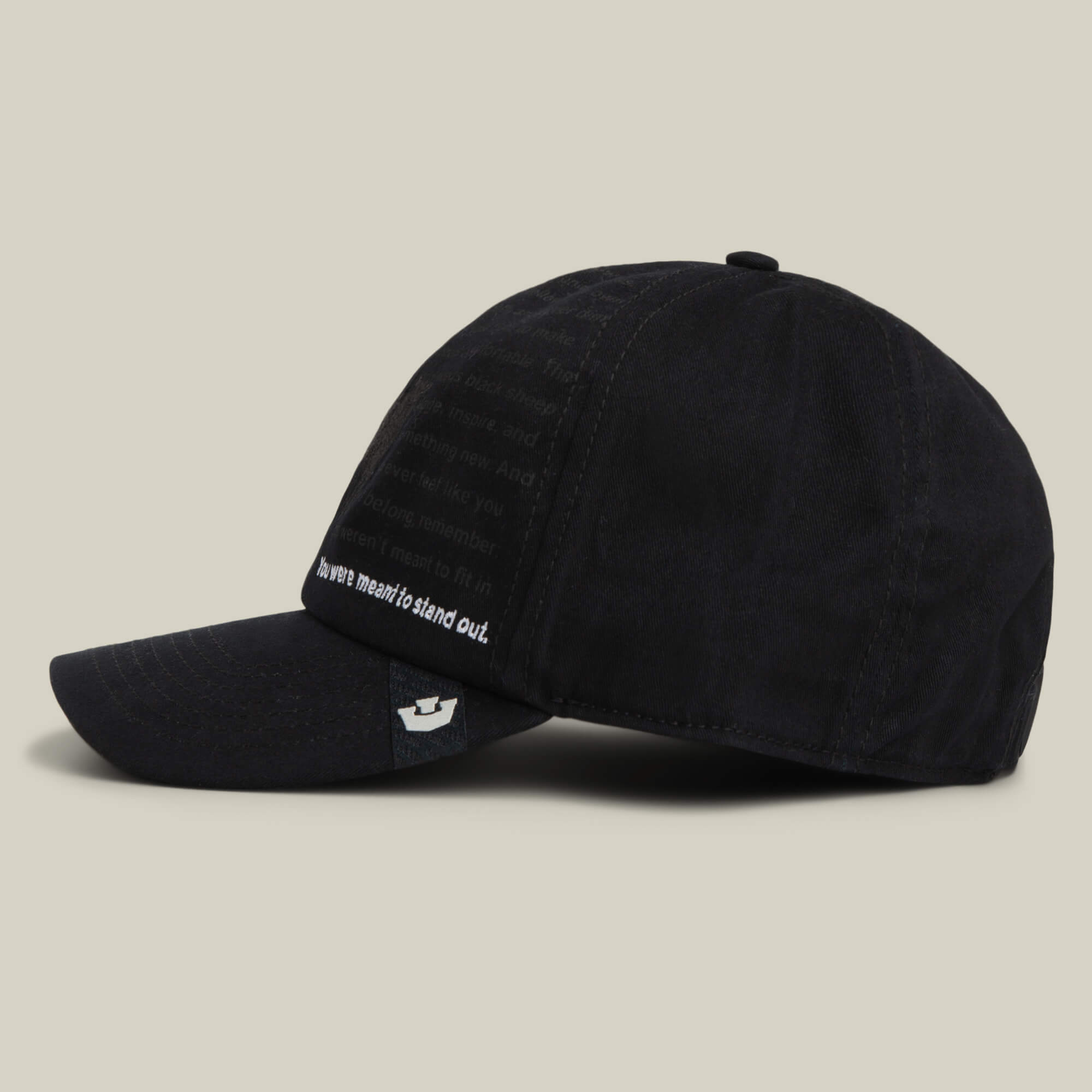 An all black papa cap with an all-over story and a black sheep moment that lands right on the brim saying you were meant to stand out. Soft structure, low profile, and a message that’s quieter than it is confident. Black colorway, black sheep energy, and proof that defining yourself doesn’t require raising your voice.