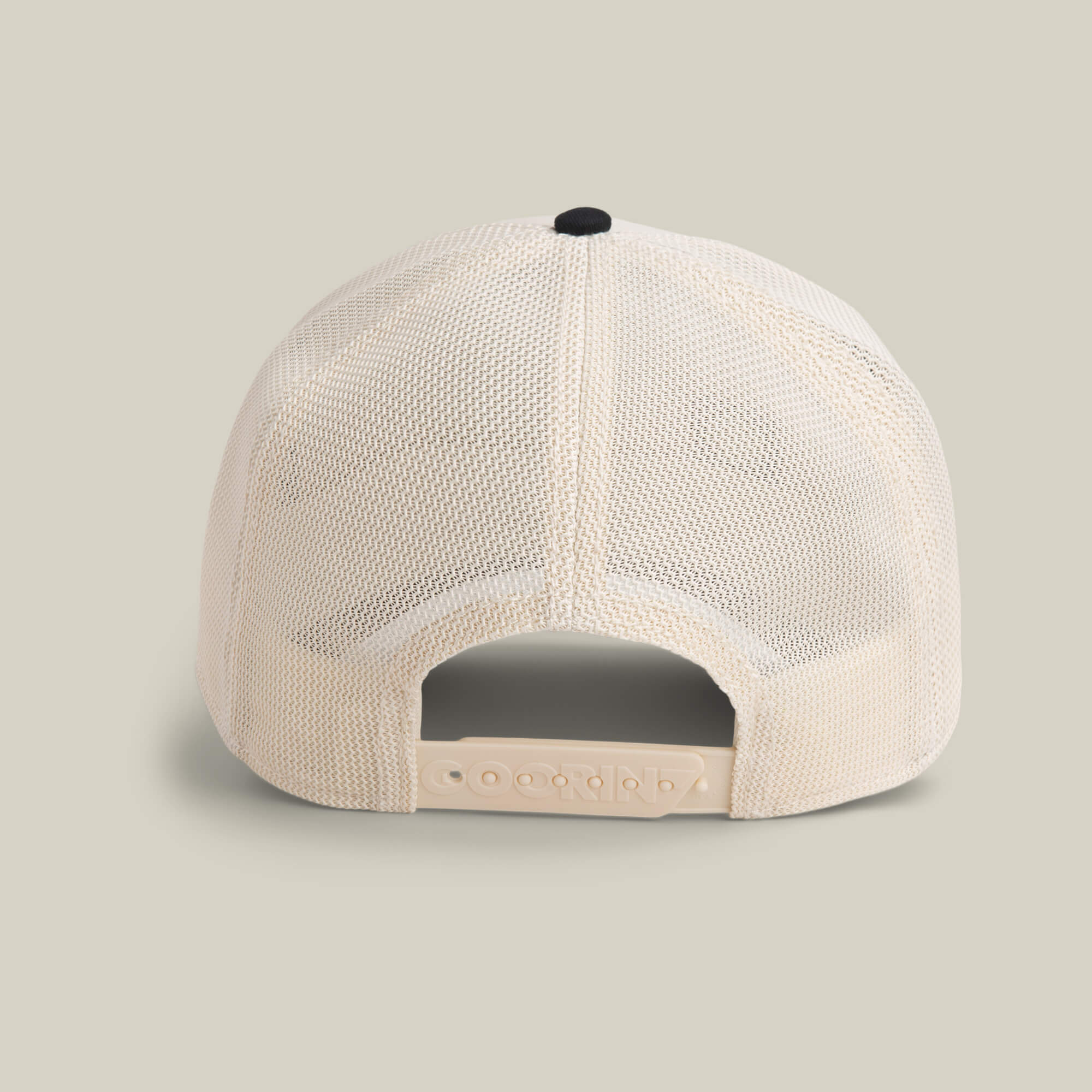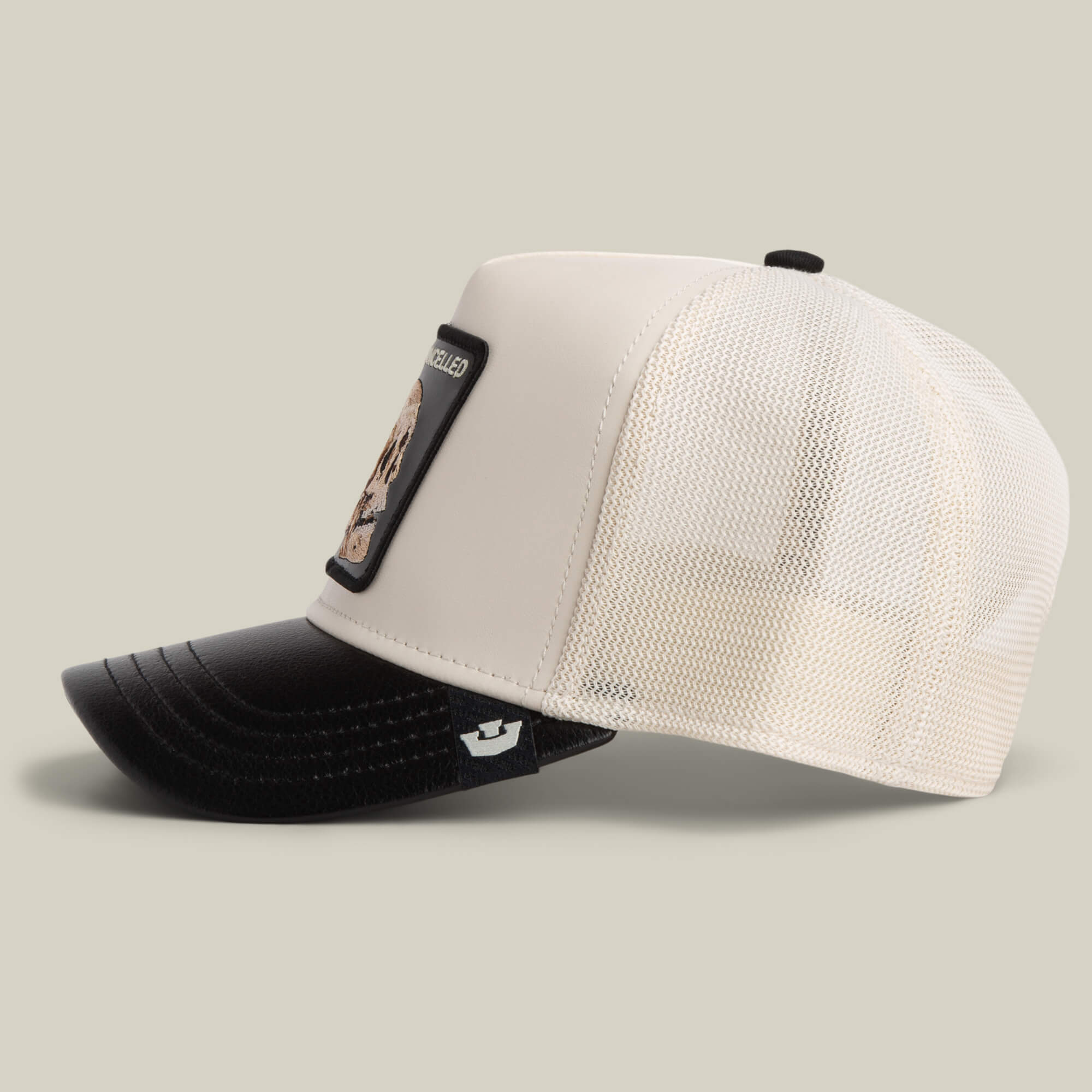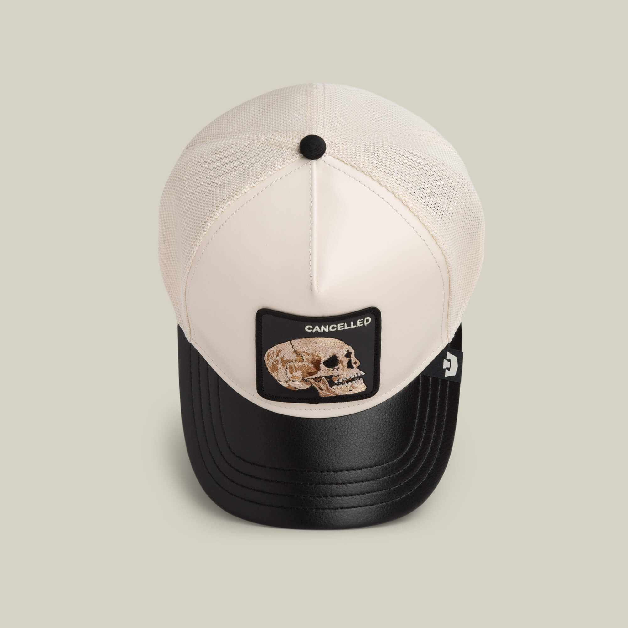 Cream faux leather up front with a black brim and a skull patch that says CANCELLED so you don’t have to. It’s clean, sharp, and slightly dramatic, like showing up polished just to bow out. Skull patch attitude, neutral colorway, and faux leather that looks expensive but doesn’t take itself seriously.