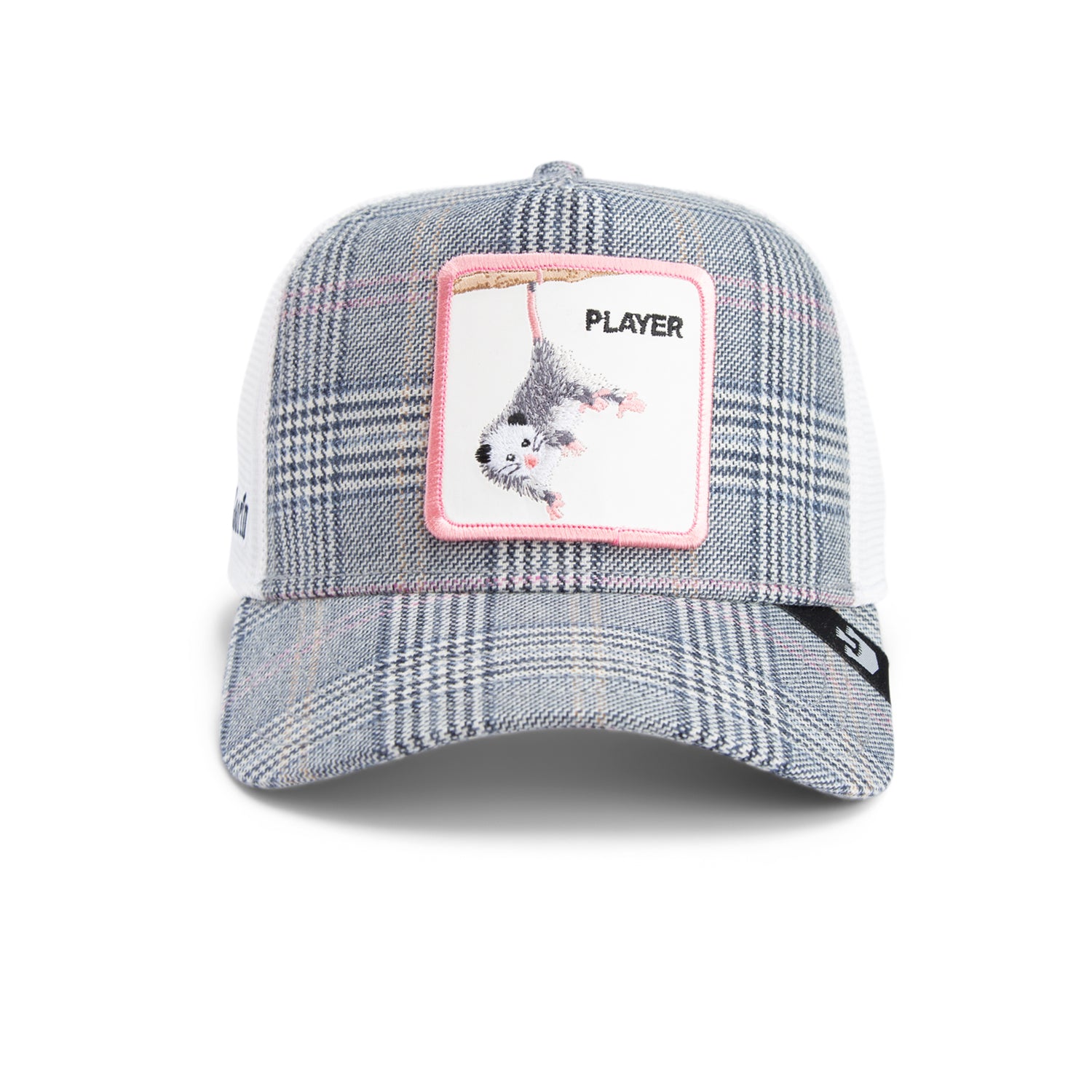 A woman wears a blue and white Goorin cap with a butterfly patch and the word SOCIAL, layered clothing including a scarf, collared denim shirt, and beige jacket—showcasing bold hat designs.