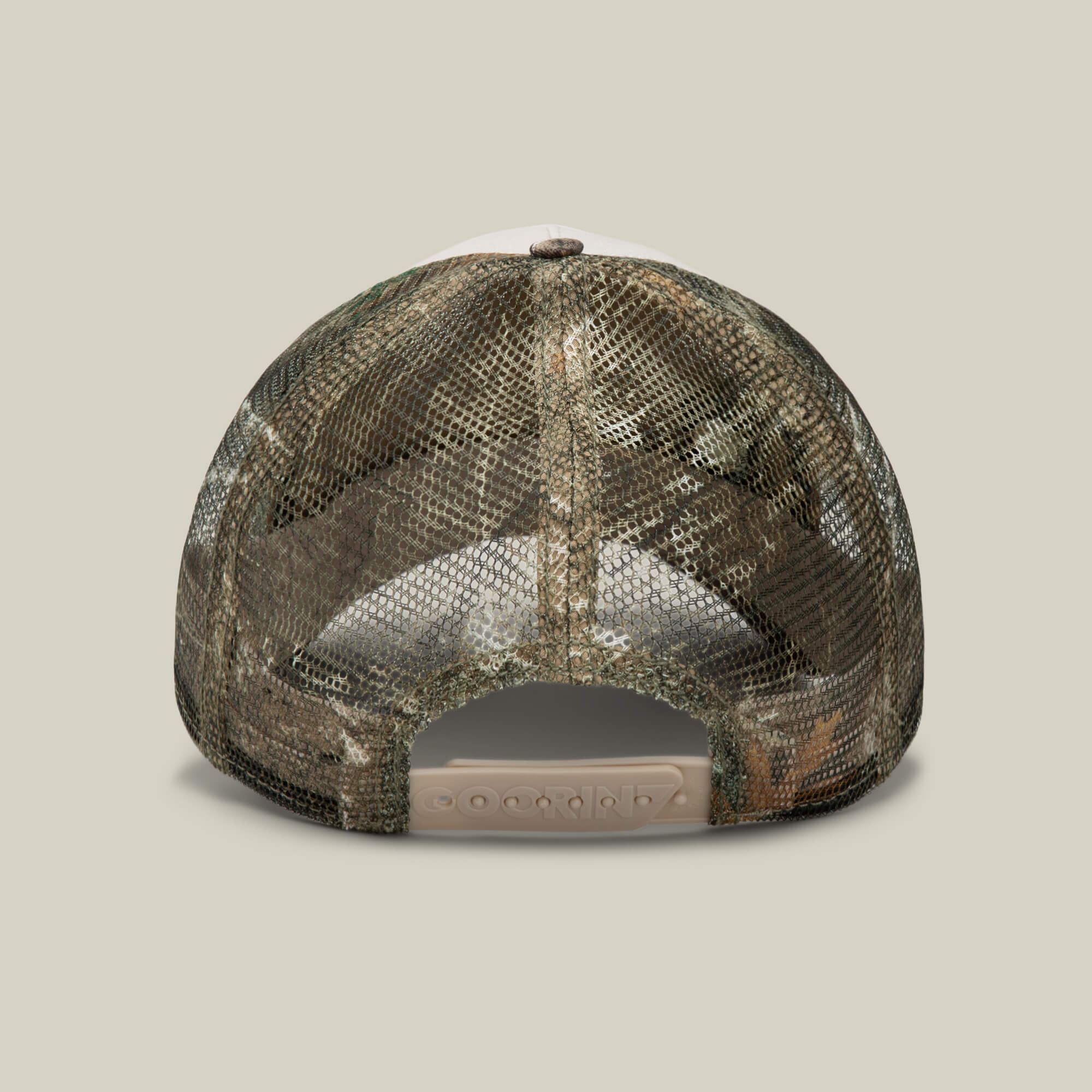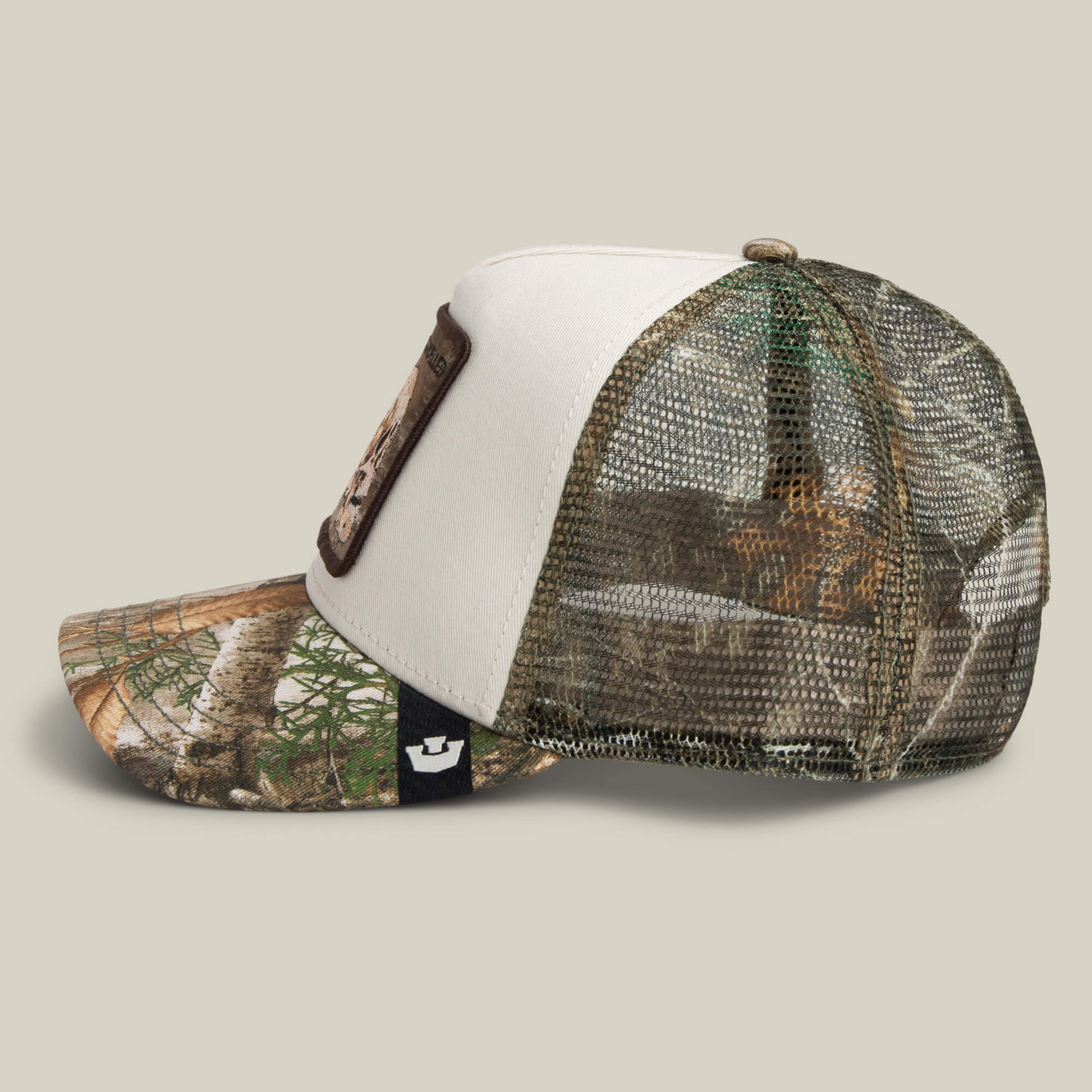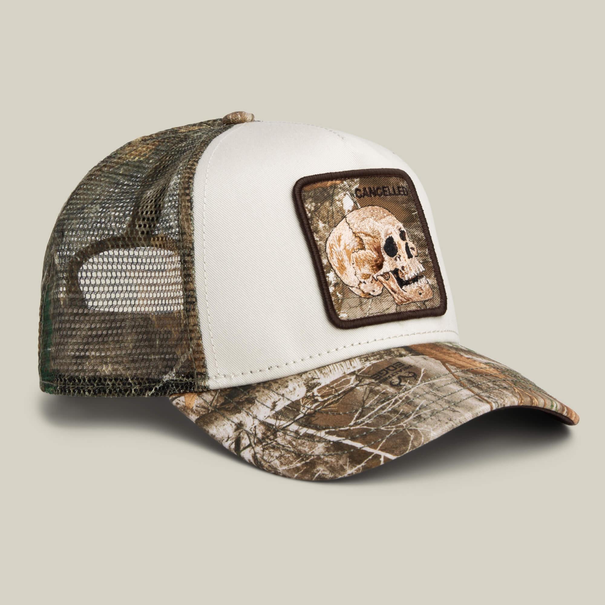 White front panel framed by Realtree Edge camo with a skull patch stamped CANCELLED, because even disappearing has limits. Clean face, dead stare, still very much present. Camo colorway contrast, skull patch defiance, and proof that you can blend in and opt out at the same time.