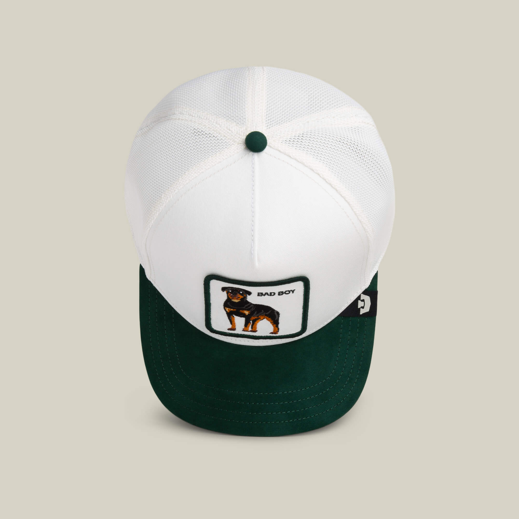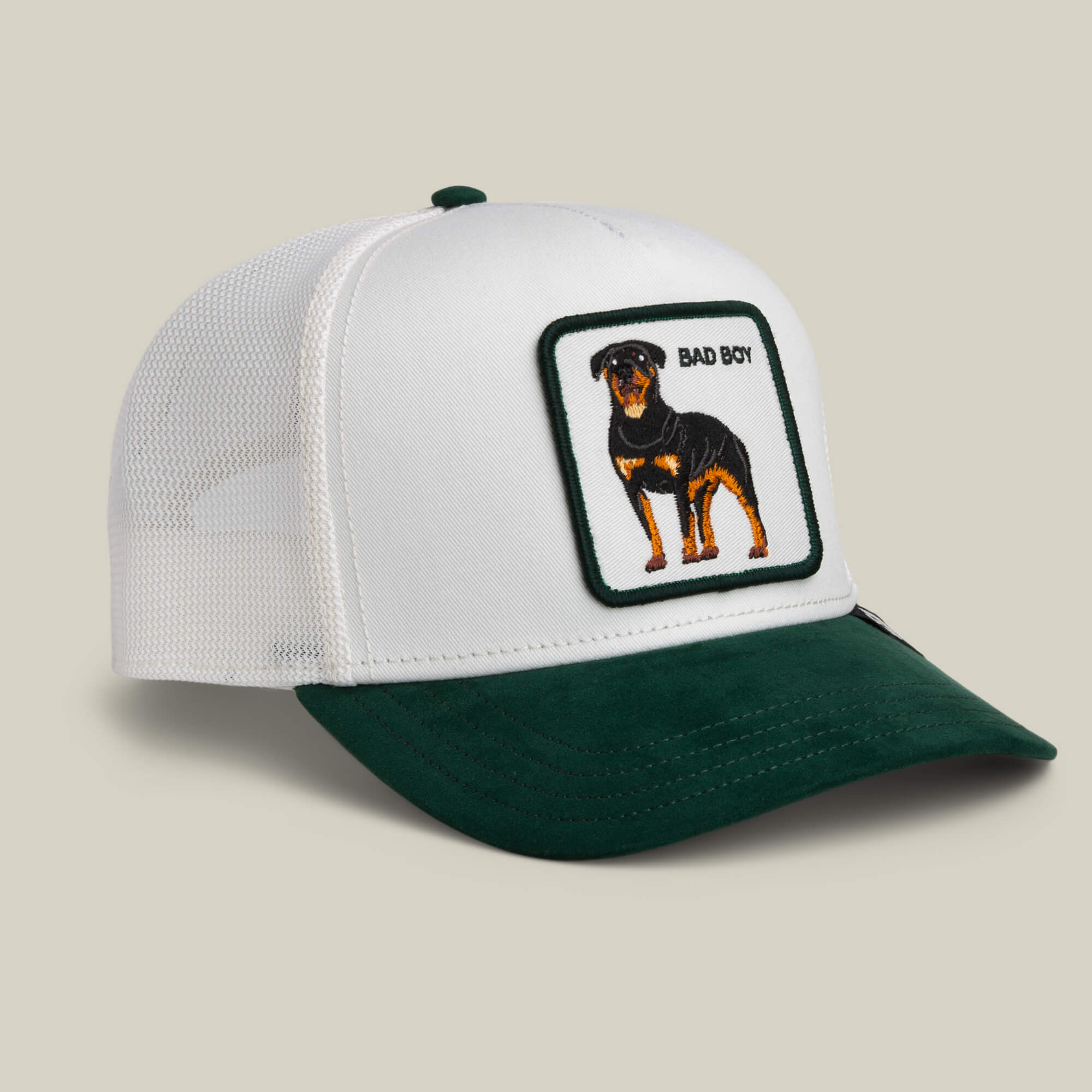 A Rottweiler patch that says BAD BOY without asking permission. Tough stance, calm stare, and zero interest in being misunderstood. White and green colorway hits clean while the dog patch handles the warning.