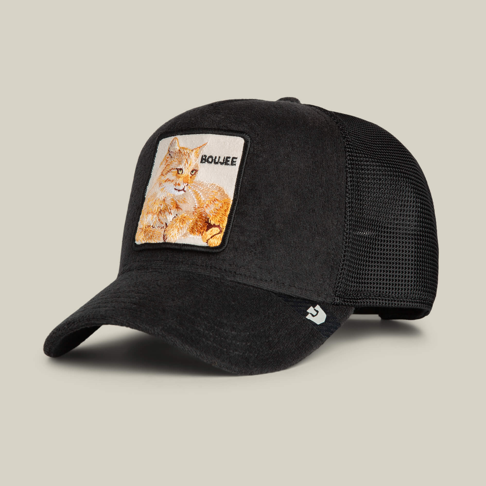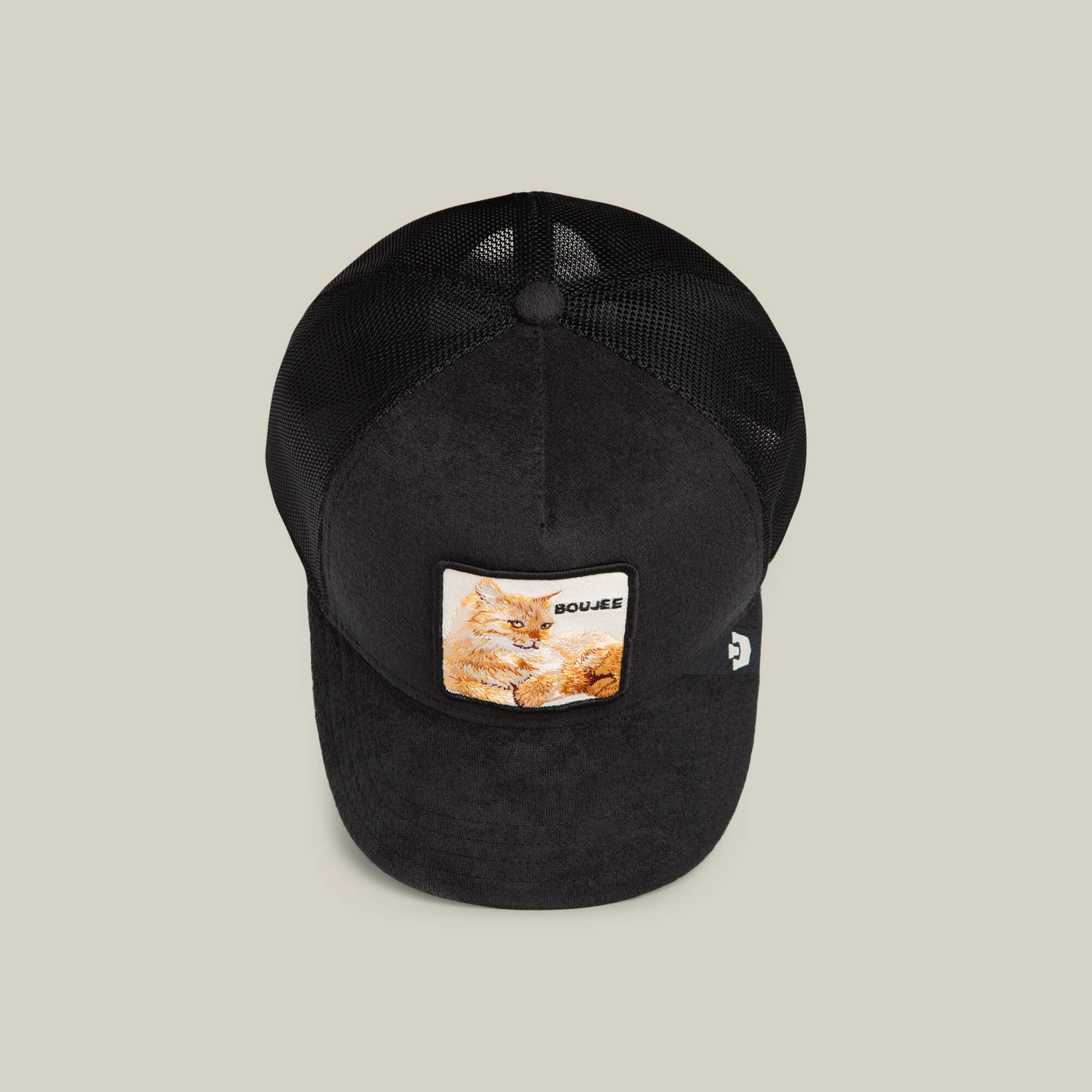 Black terry cloth gives this one a plush, almost lounge-level softness. A confident kitty sits proudly on the patch with BOUJEE stitched beside it. Clean. Sharp. Comfortable in a way that feels intentional, not precious.