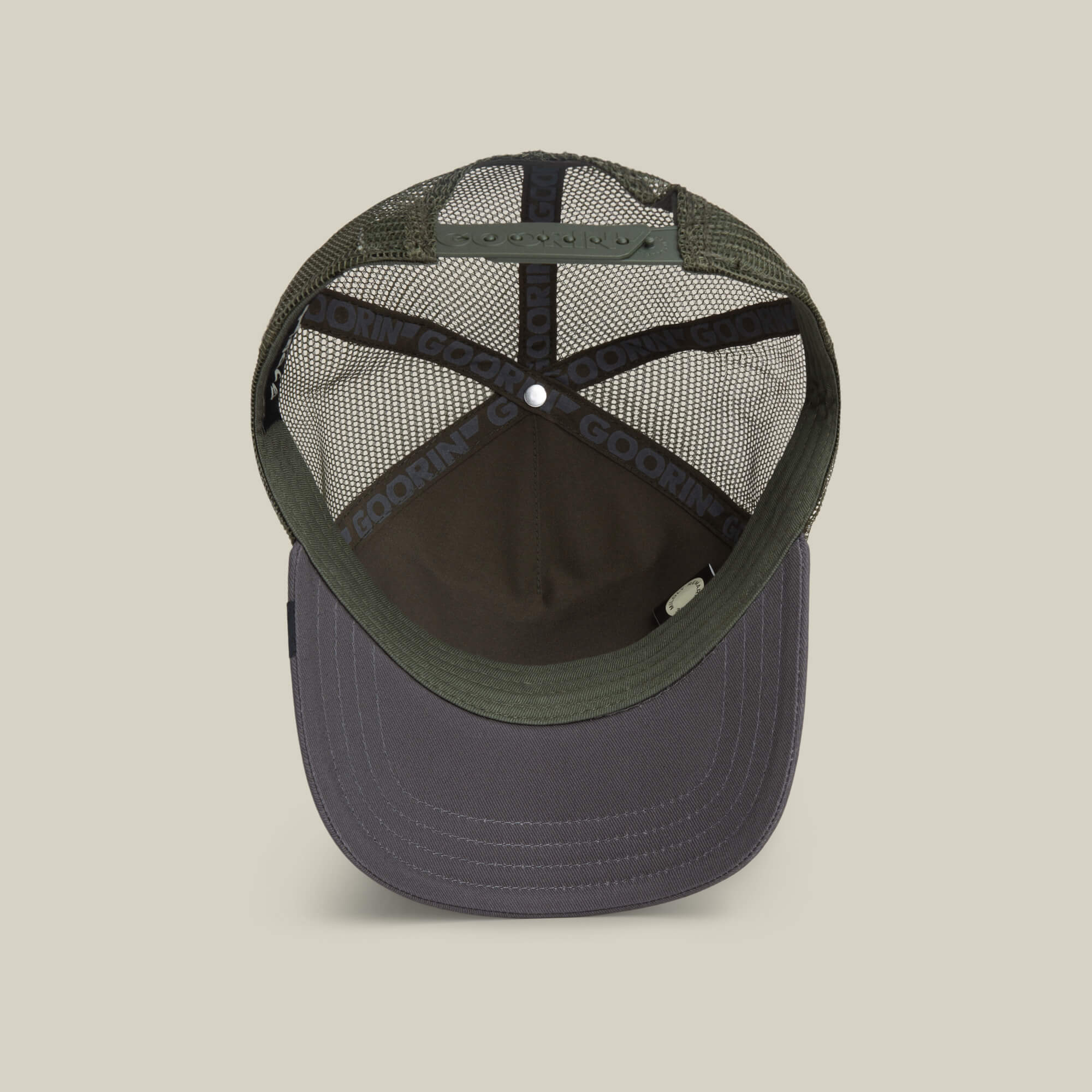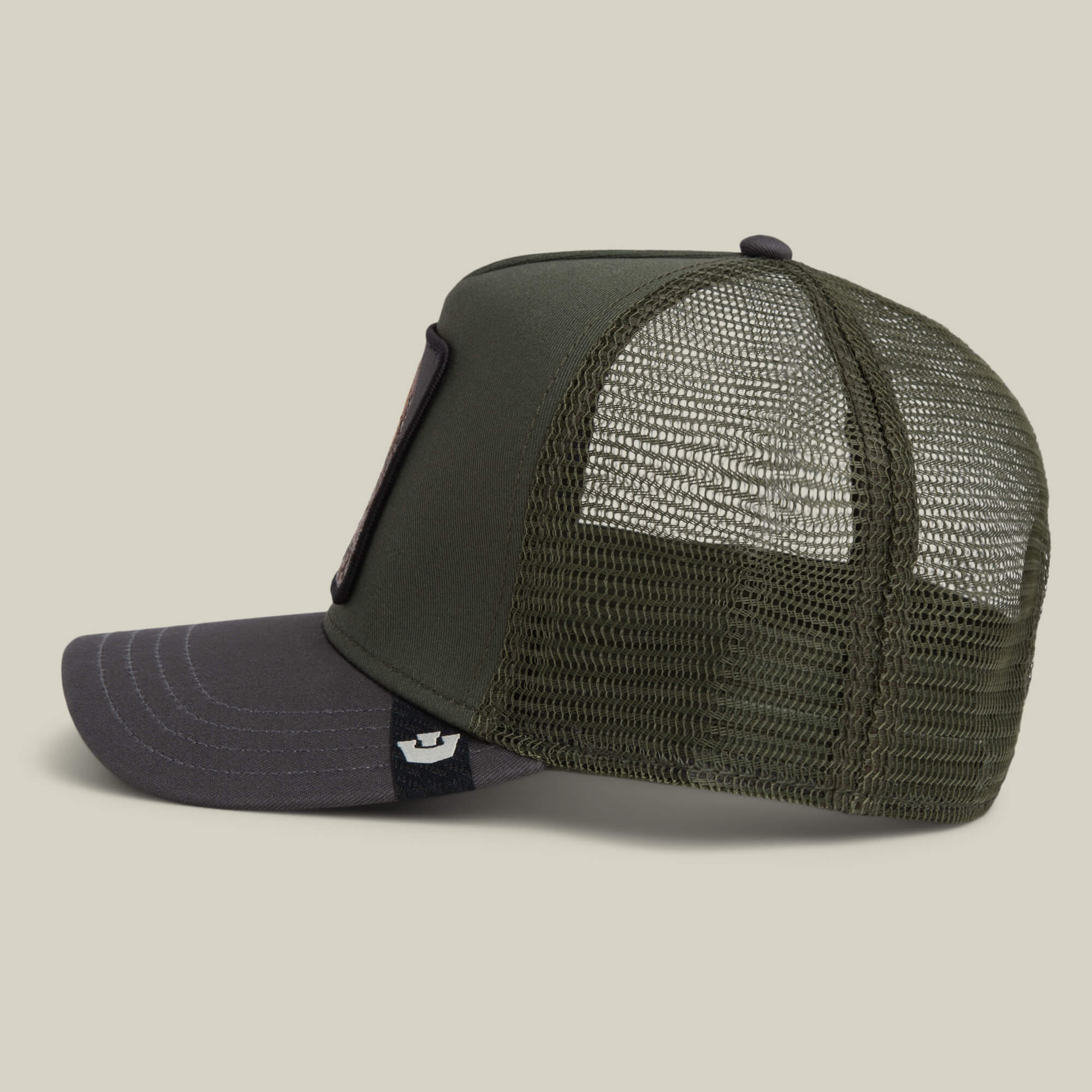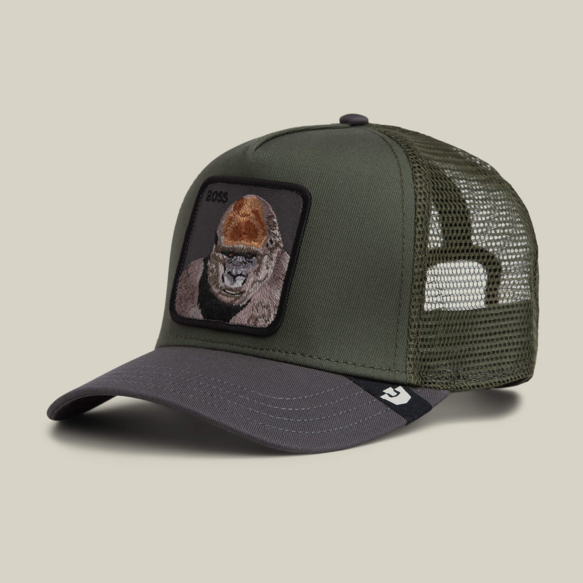 Deep olive trucker with a gorilla patch stamped BOSS, because authority doesn’t ask for it. Heavy stare, broad shoulders, zero debate. Green colorway muscle, gorilla patch dominance, and energy that ends conversations early.