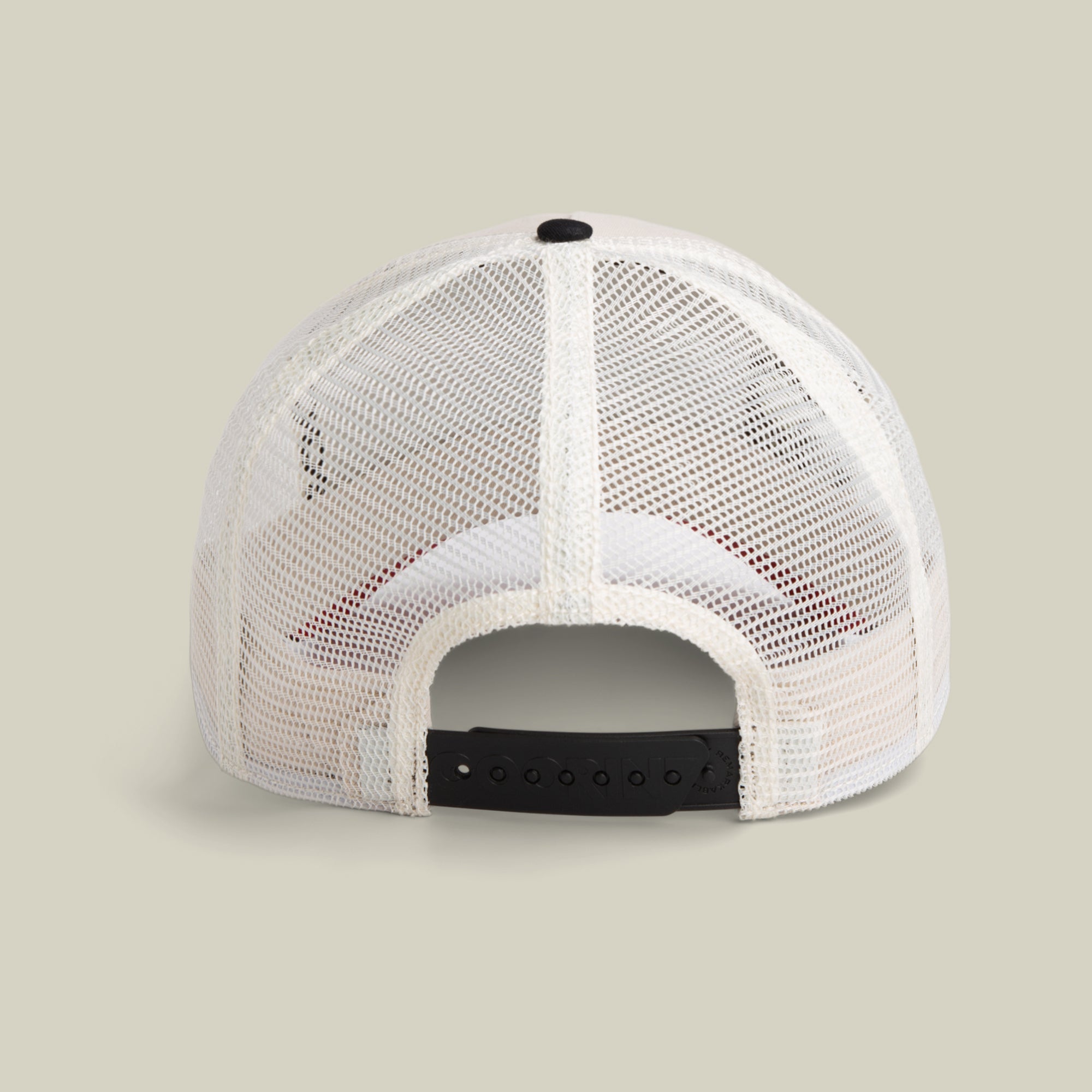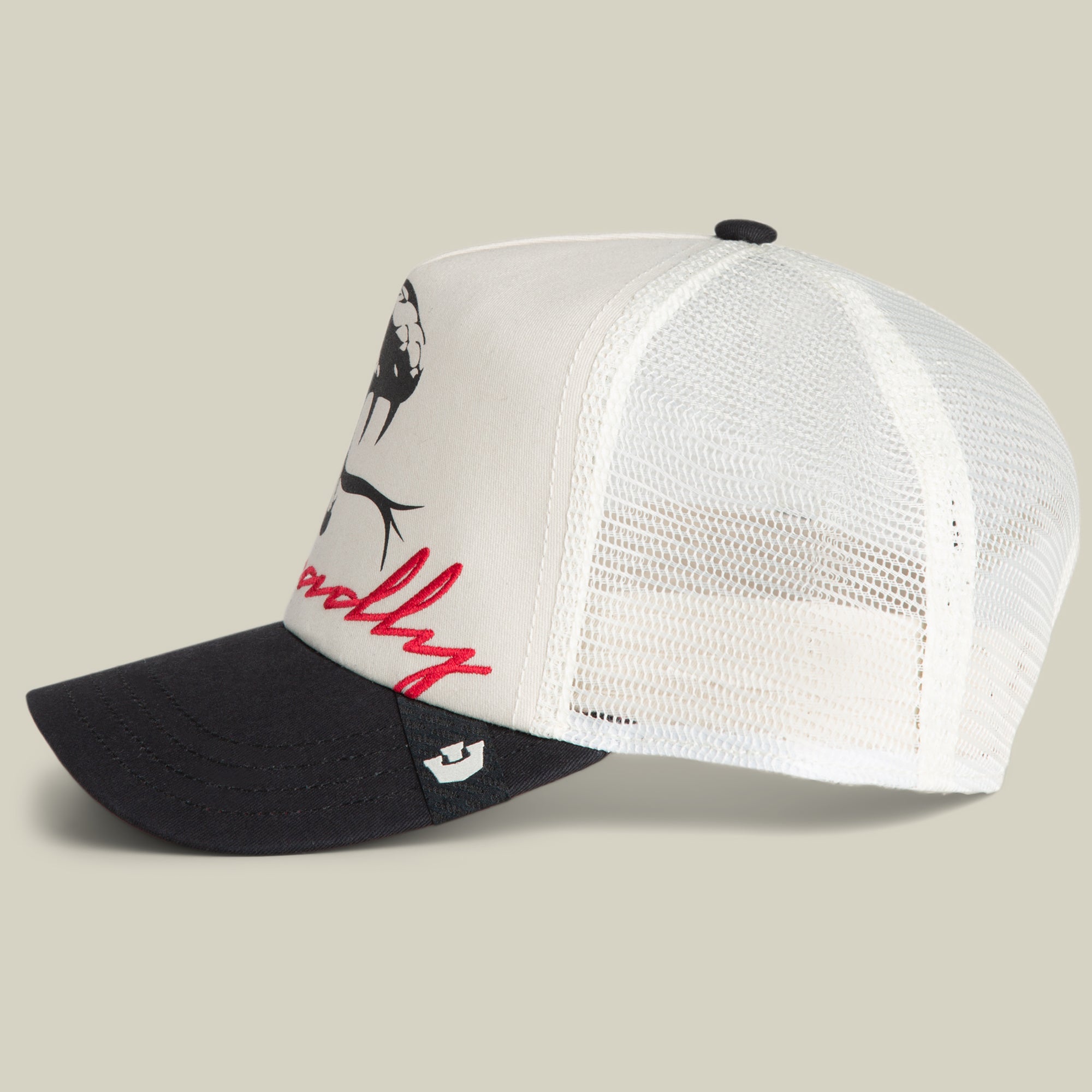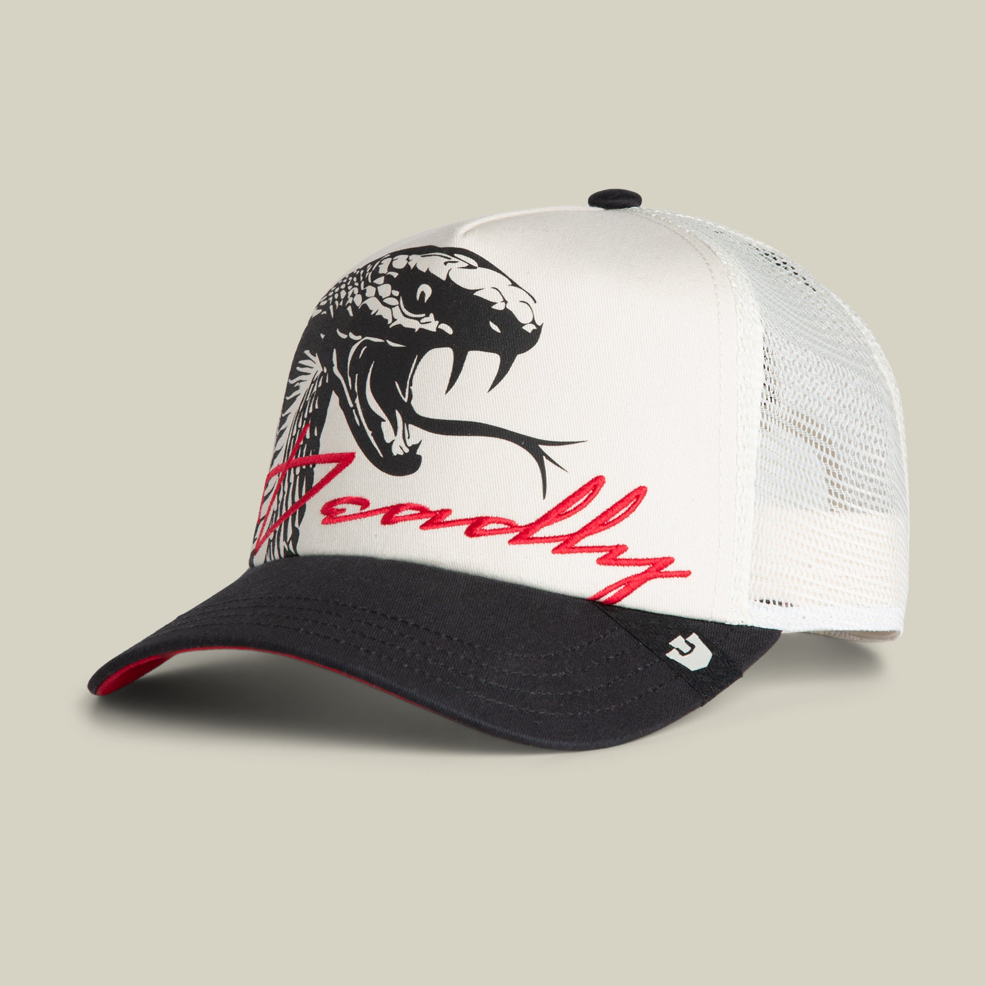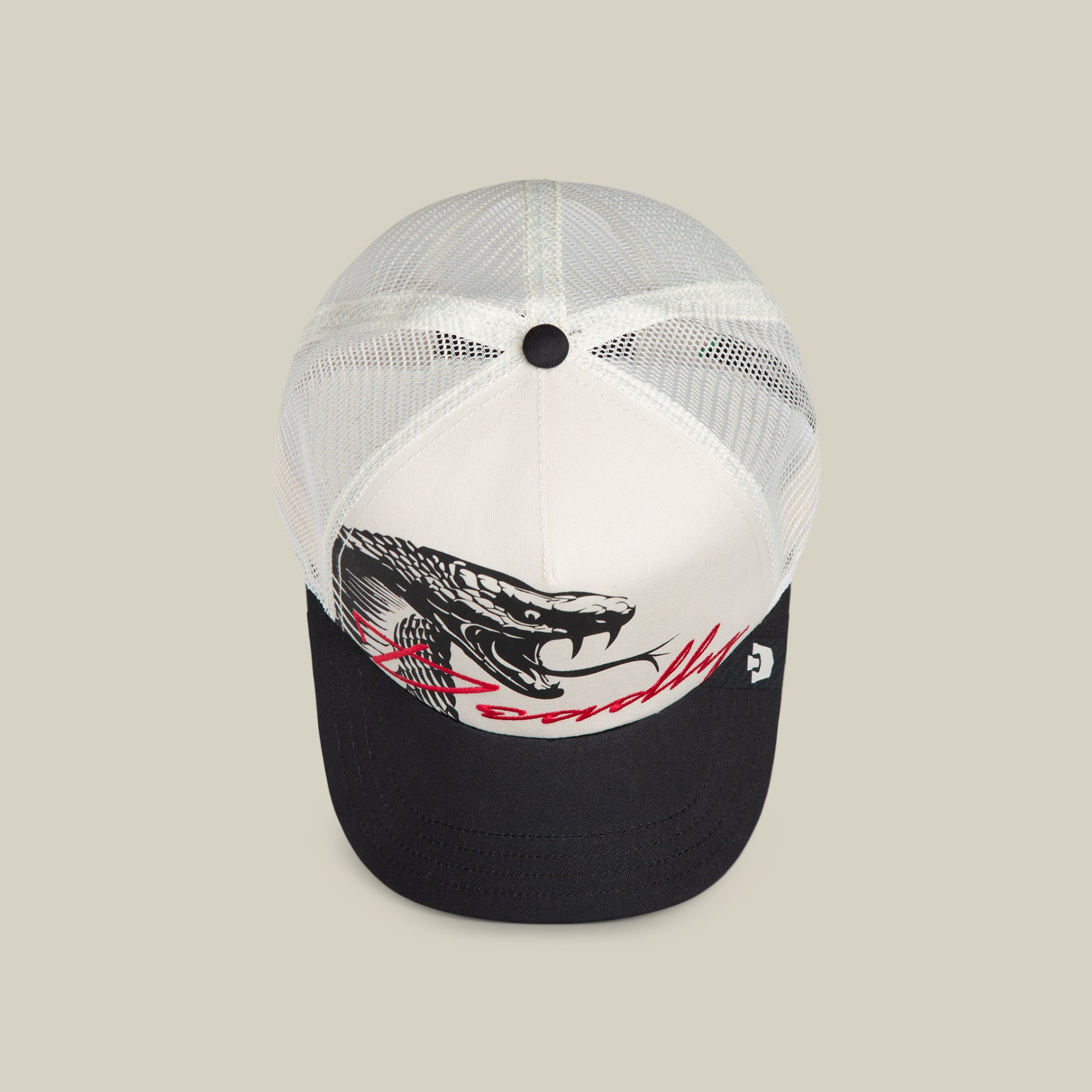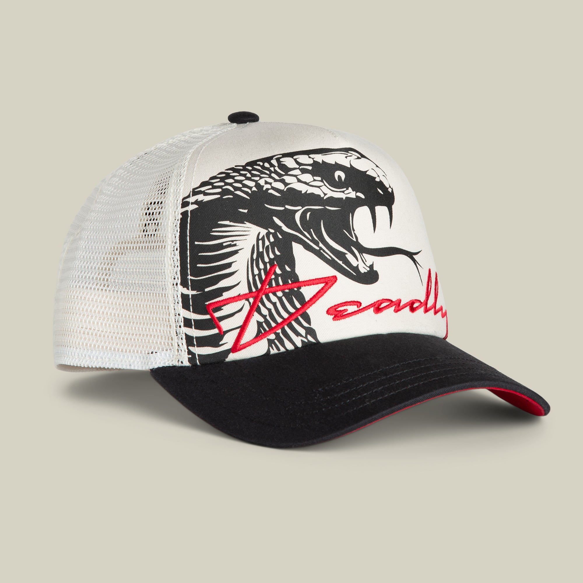 Cream front with a black brim and mesh back, featuring a snake patch mid-strike and Deadly written in red script like a promise, not a warning. Fangs out, tongue flicking, zero hesitation. Snake patch menace, cream and black colorway, and the kind of energy that doesn’t chase, it waits.