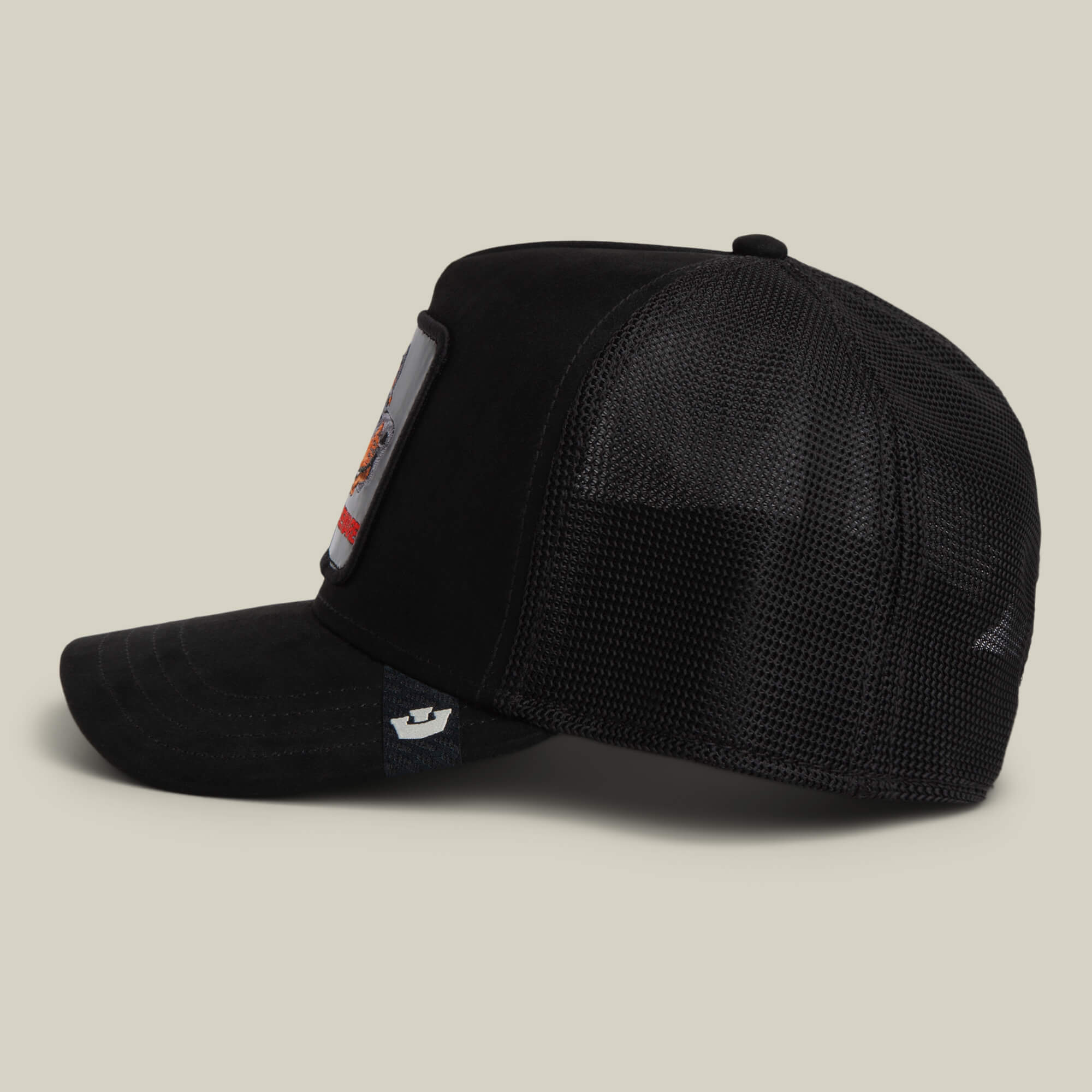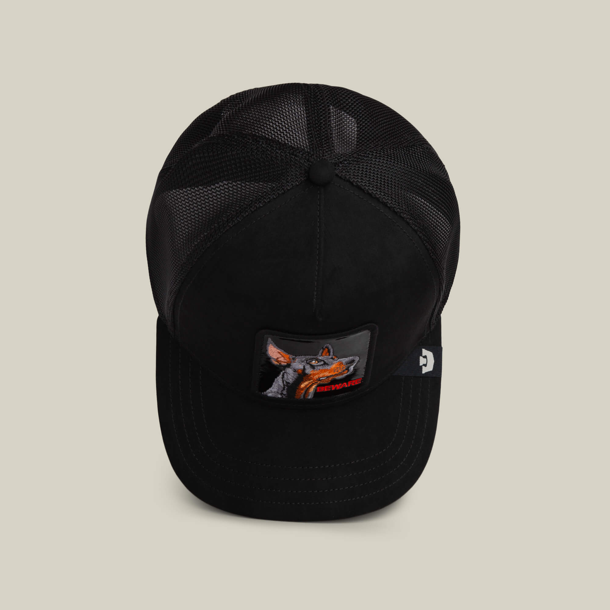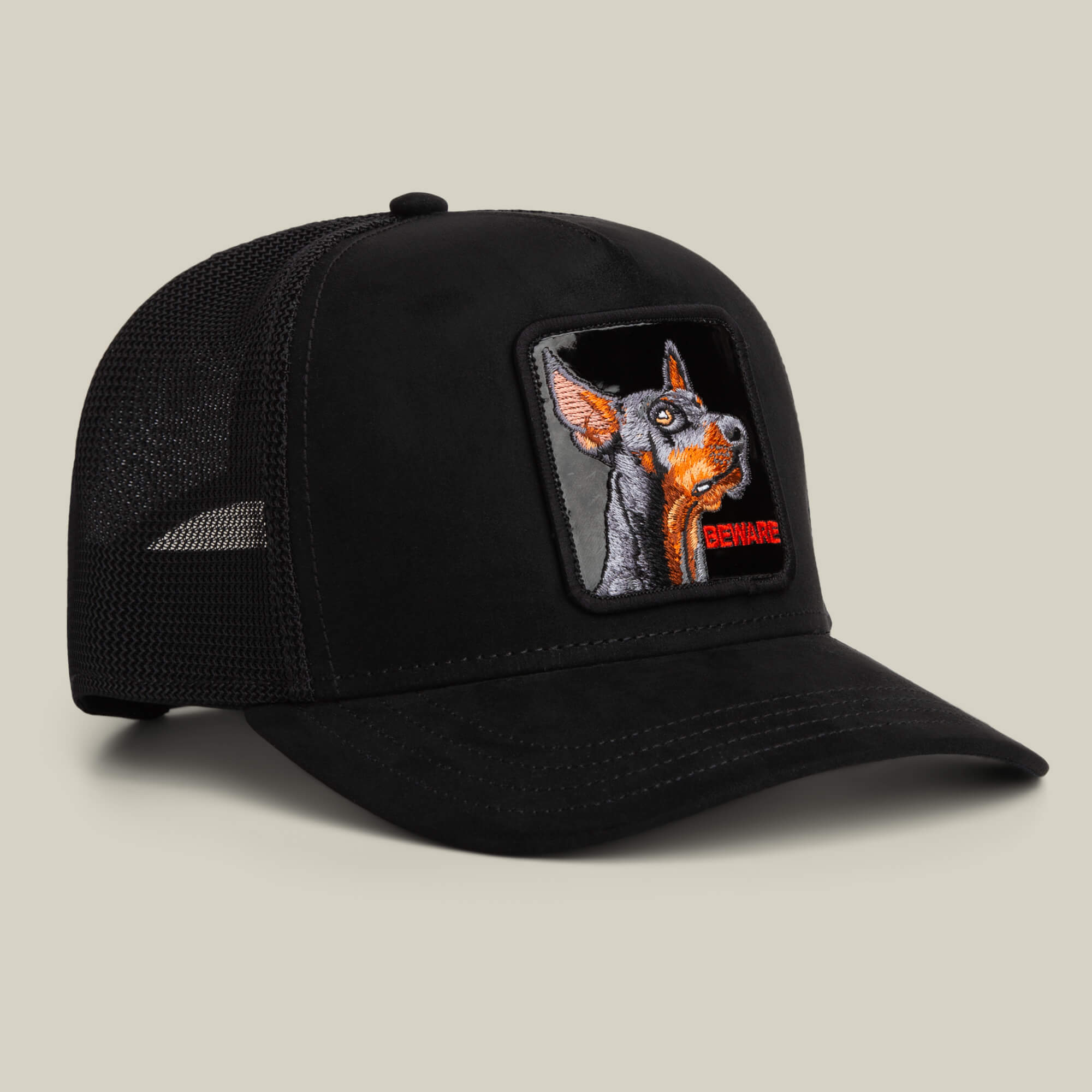 All black suede with a Doberman animal patch that says BEWARE, because subtlety is overrated. The black colorway keeps it clean while the sharp ears and orange accents make the warning impossible to miss. Loyal if you’re in the circle, a problem if you’re not.